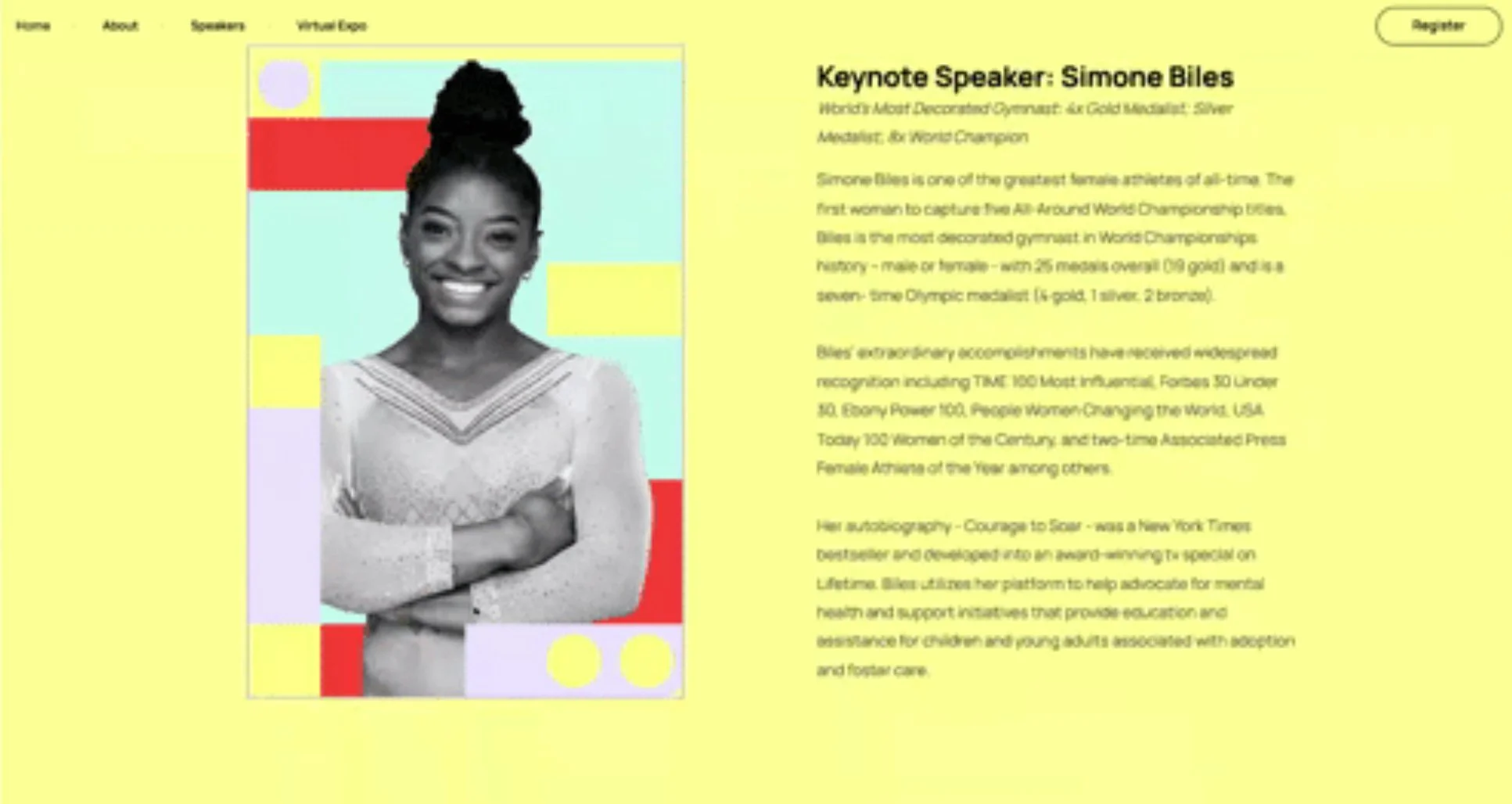 Pinterest’s 4th annual women’s conference was not just a virtual event, but a fully immersive experience that engaged over 1600 attendees, 28 speakers, and 24 featured women/nonbinary-owned businesses. The event, which took place 100% virtually, was a breath of fresh air in the midst of an isolating year, thanks to its interactive elements. The global programming, spanning 4 regions, and featuring stellar speakers like Simone Biles, Vashtie Kola, and Noor Tagouri, was a highlight. The 5 virtual speaker stages in Hopin, the branded swag, the small business marketplace, and the intimate networking rooms all contributed to making this a memorable event over the course of 2 days.